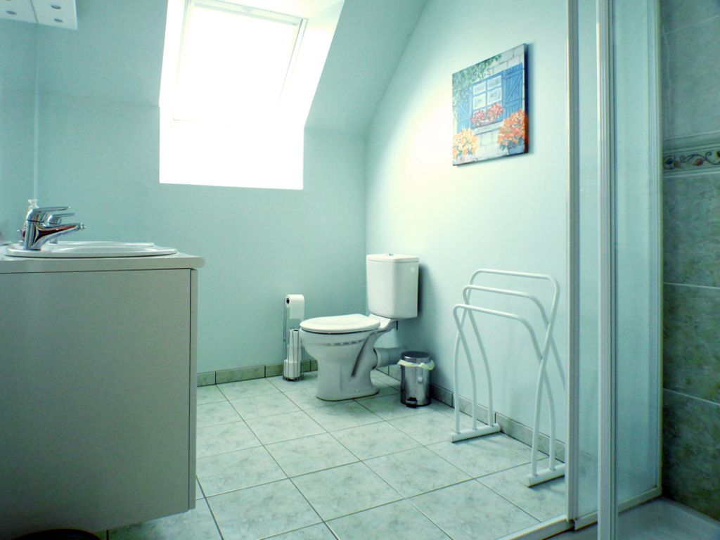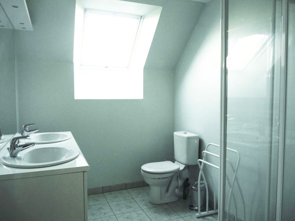 Upstairs, bathroom 2 has a shower cubicle, a double sink vanity unit with overhead lighting and a towel rail. The loo is integral with the bathroom. The floor is of ceramic tiles and has under-floor heating.