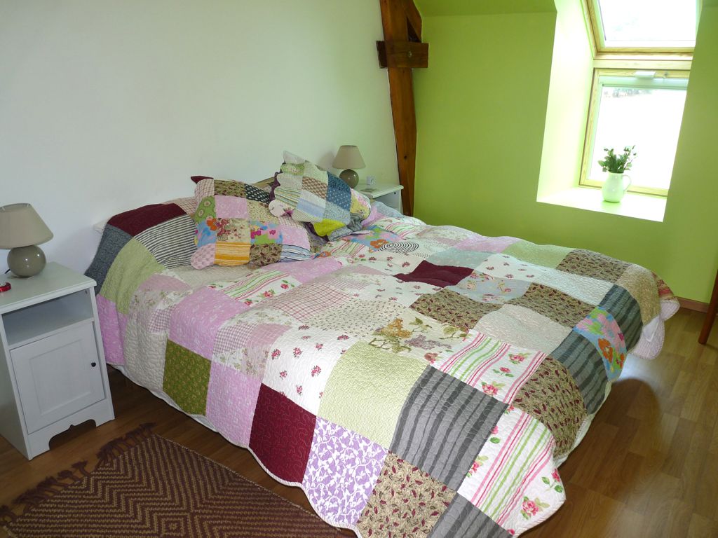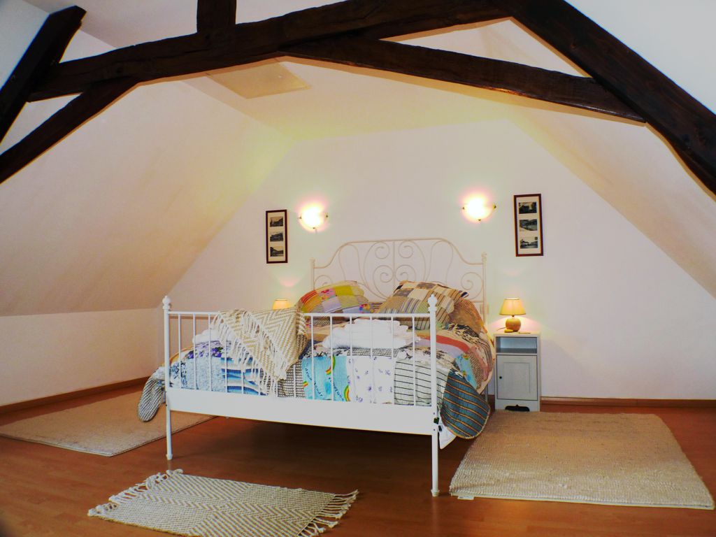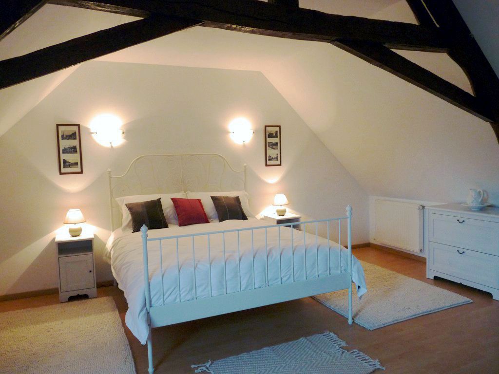 The master bedroom (28 square meters) on the first floor is big and has a high ceiling with exposed oak beams. The big metal bed is a generous continental king-size (200x160 cm) with a very comfortable mattress and pristine high quality cotton bed linen. The duvet and four pillows are filled with luxury microfibre and are therefore perfect for anyone with allergies or sensitive skin. Heating is by way of two modern radiators. There's a wood laminate floor with thick fluffy bedside rugs.