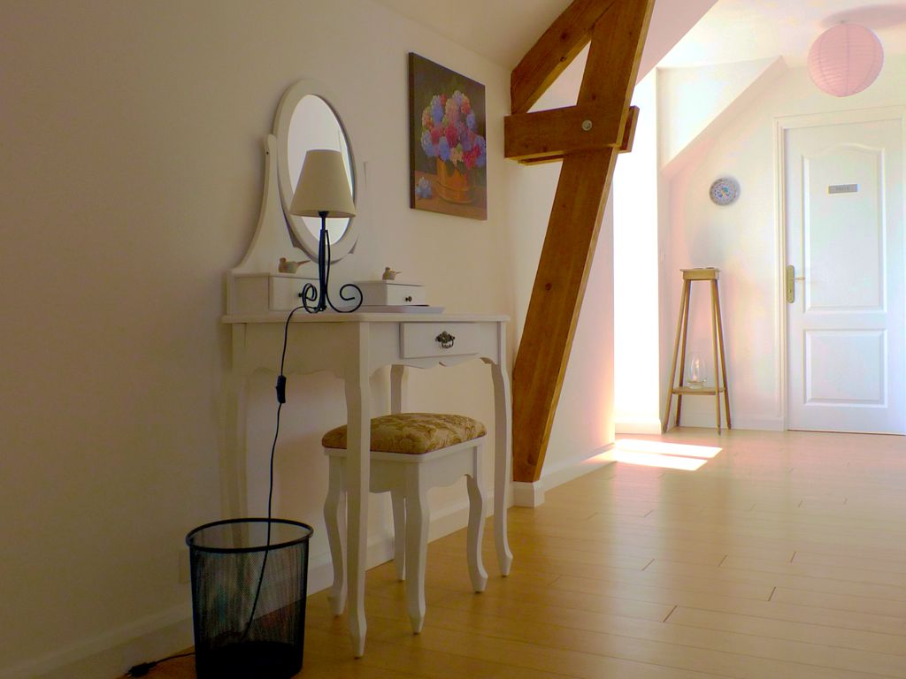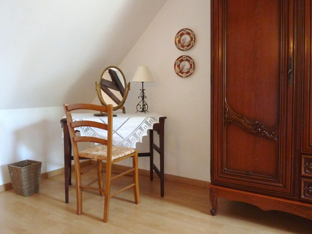 There's a big traditional French wardrobe with lots of storage space and hangers, a dressing table with mirror, a separate chest of drawers and two comfy wicker armchairs. This bedroom is separated from the other two by the mezzanine (see the floor plan) so is nice and private.