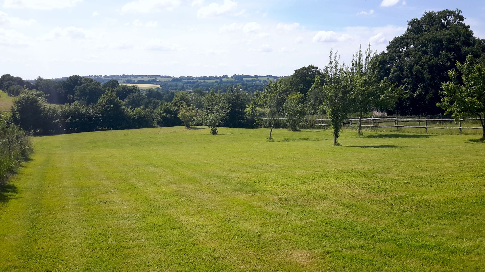 The large, secluded back garden is mainly grass and is surrounded by fields, The front of the house and the entire garden get the sun all day long and you can create your own recreational area using the many tables and chairs available. There are, depending on the time of year, strawberries, apples, cherries and plums in the garden. There are sun loungers, café style tables with parasols, comfy fold-up chairs, a couple of wooden benches and lots of lightweight chairs.