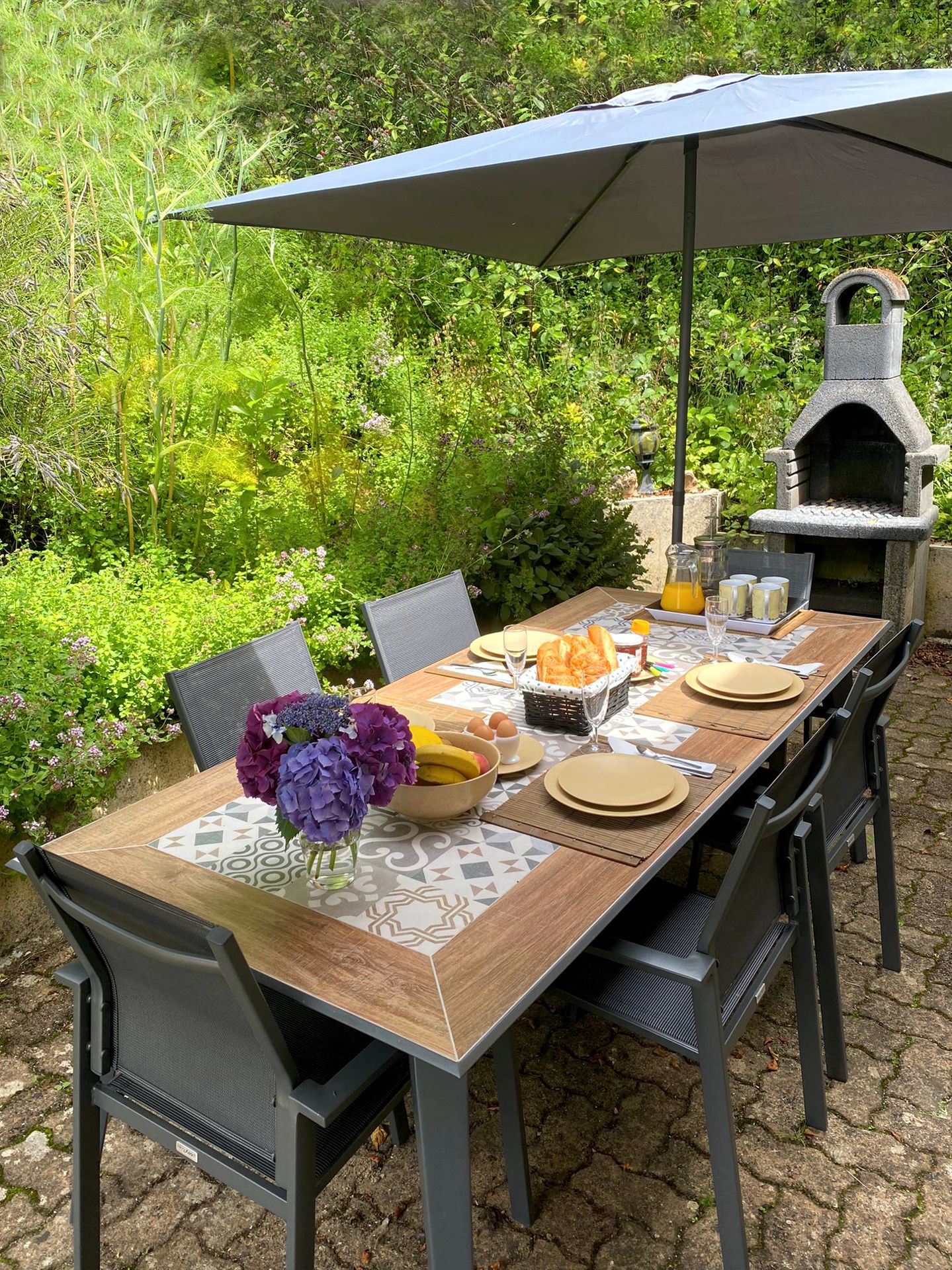 There is a big ceramic topped aluminium table with six chairs, large parasols and additional chairs should they be needed.